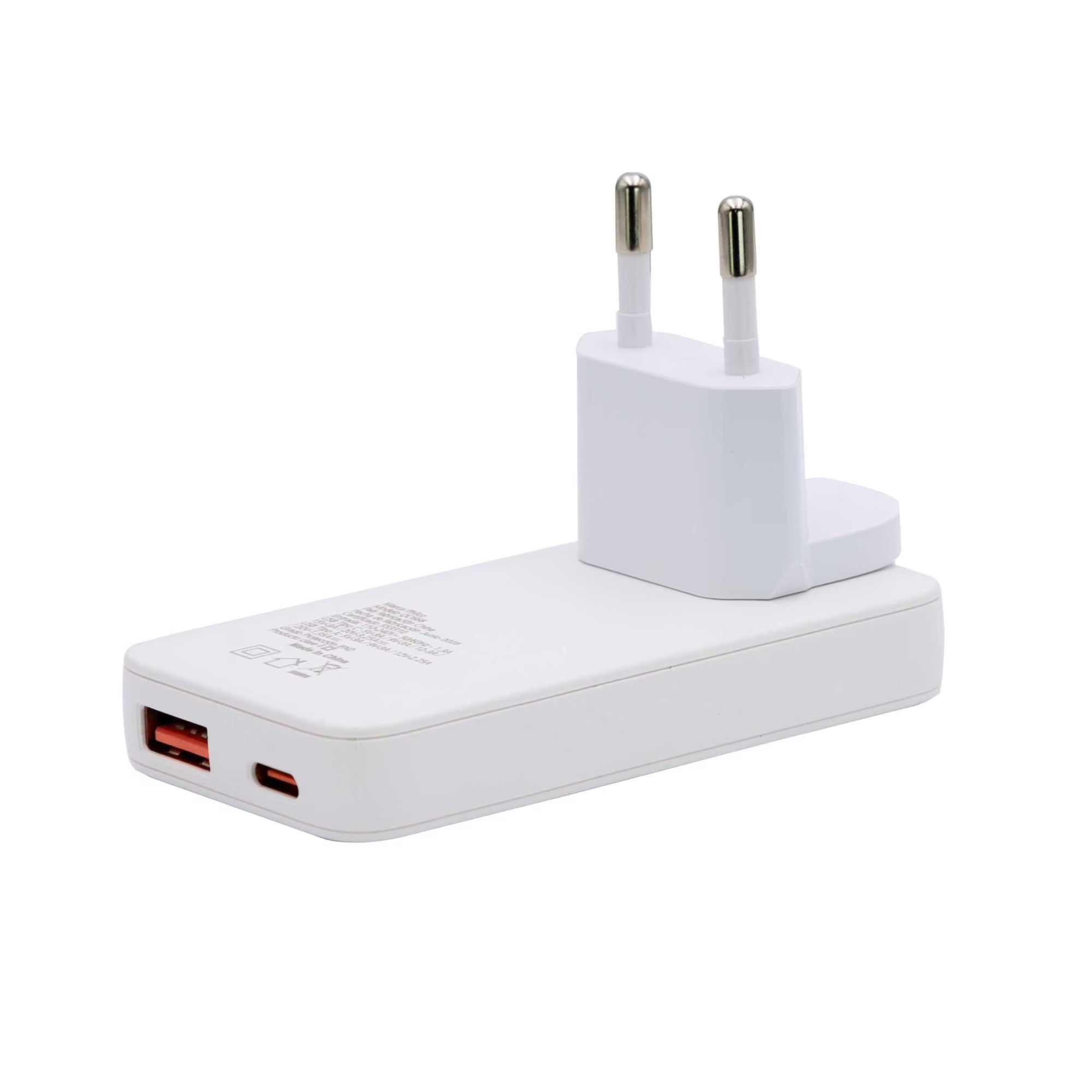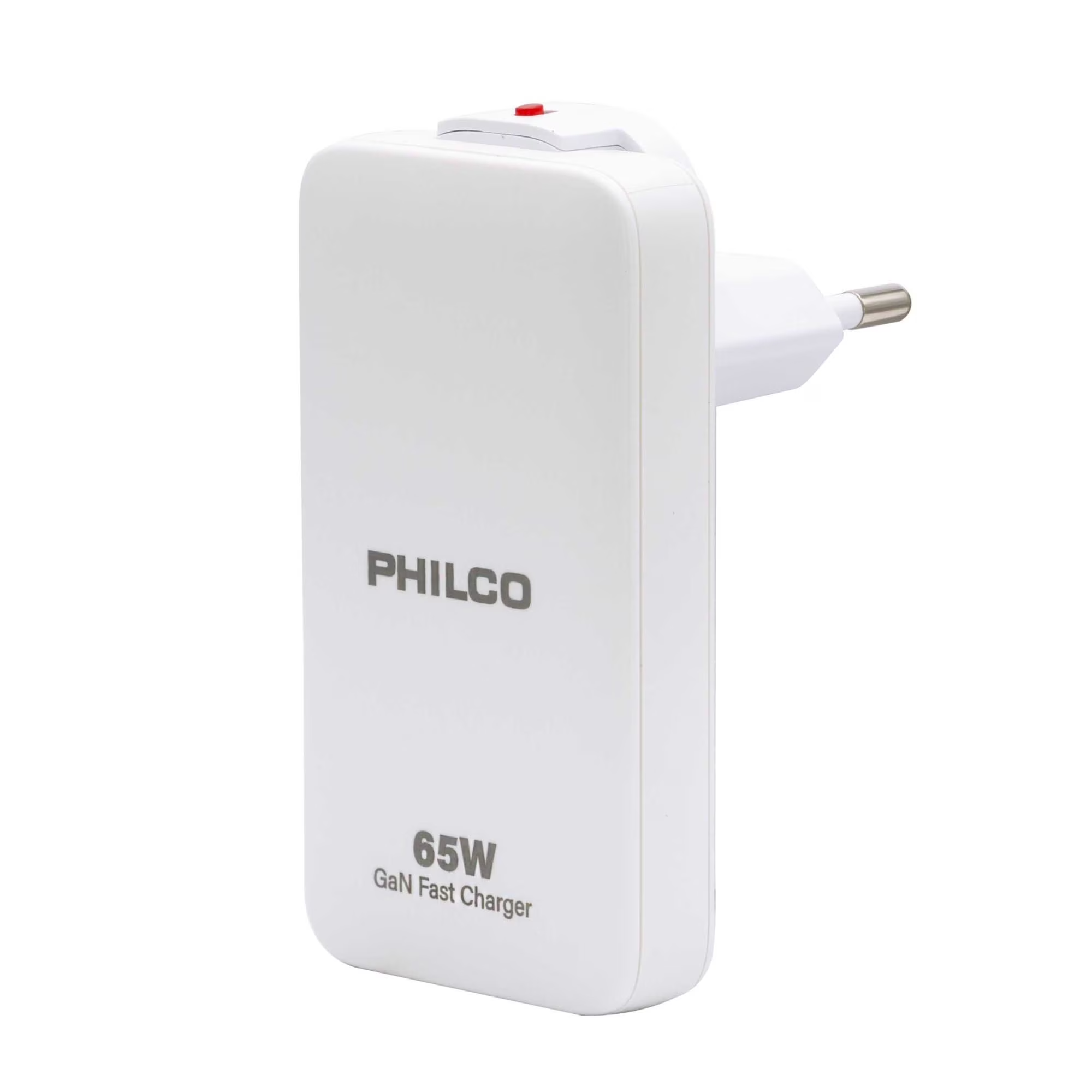 Cargador de pared superrápido Philco QC668 de 65W, que cuenta con puertos USB-A y USB-C.