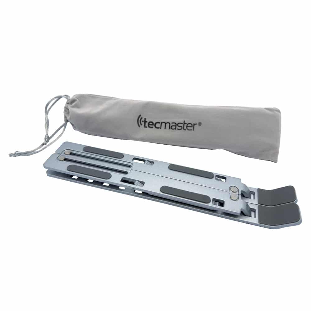 Soporte ajustable Tecmaster de aluminio para notebook. Mejora la ergonomía, ventilación y postura de trabajo. Ideal para oficina y home office.
