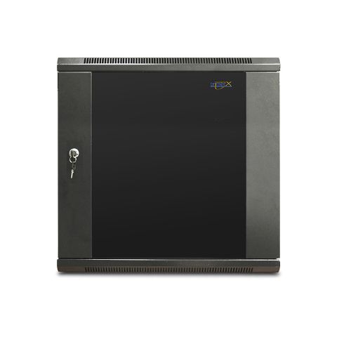Gabinete Rack Mural Trimerx 12U (600x600mm) diseñado para organizar equipos de red. Formato armable para fácil transporte, con puerta de vidrio templado, paneles laterales desmontables y kit de ventilación incluido.